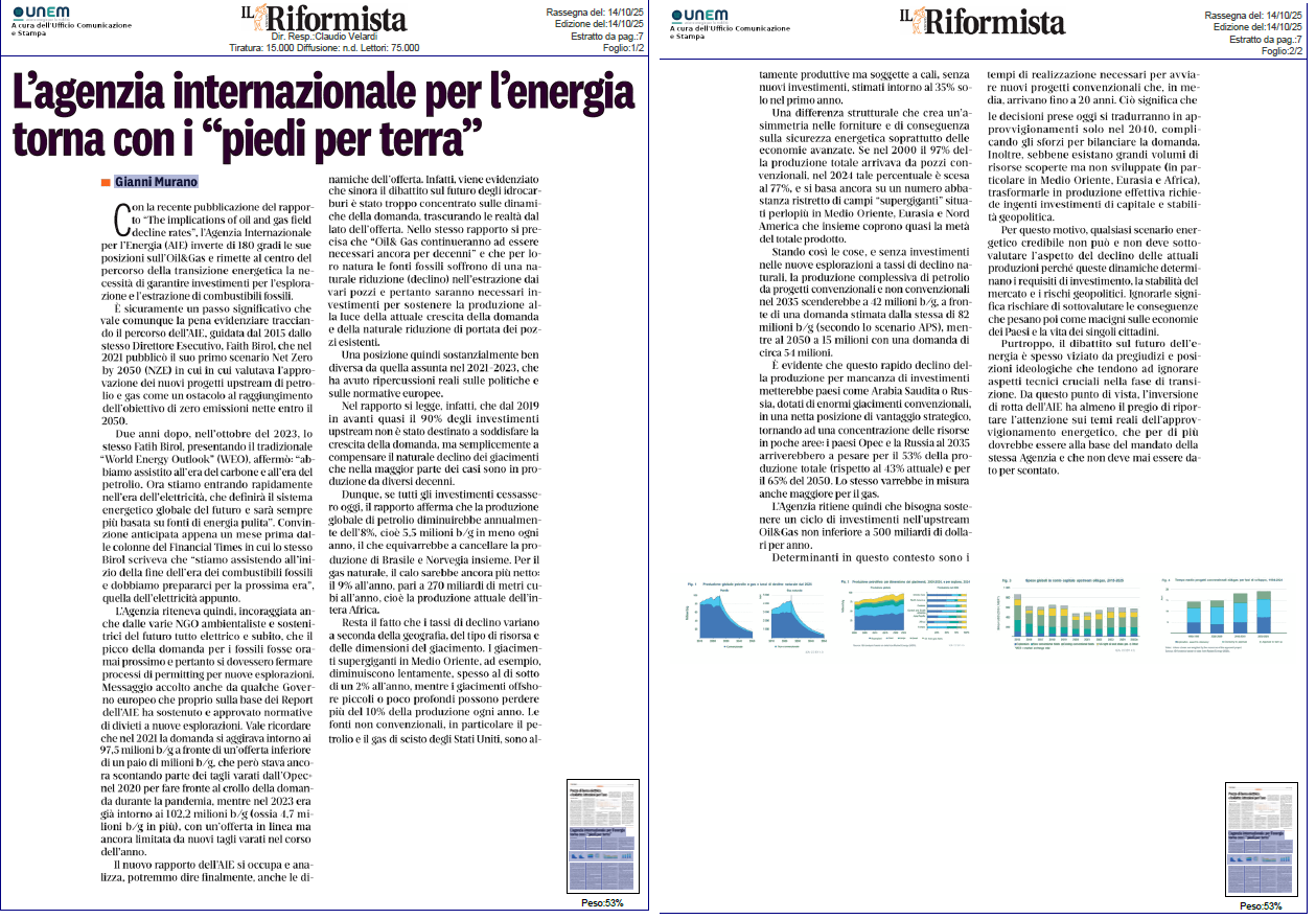 Il commento del presidente di UNEM Gianni Murano alla decisione recente dell’AIE di modificare le sue posizioni sull’Oil&Gas rimettendo al centro del percorso della transizione energetica la necessità di garantire investimenti per l’esplorazione e l’estrazione di combustibili fossili.