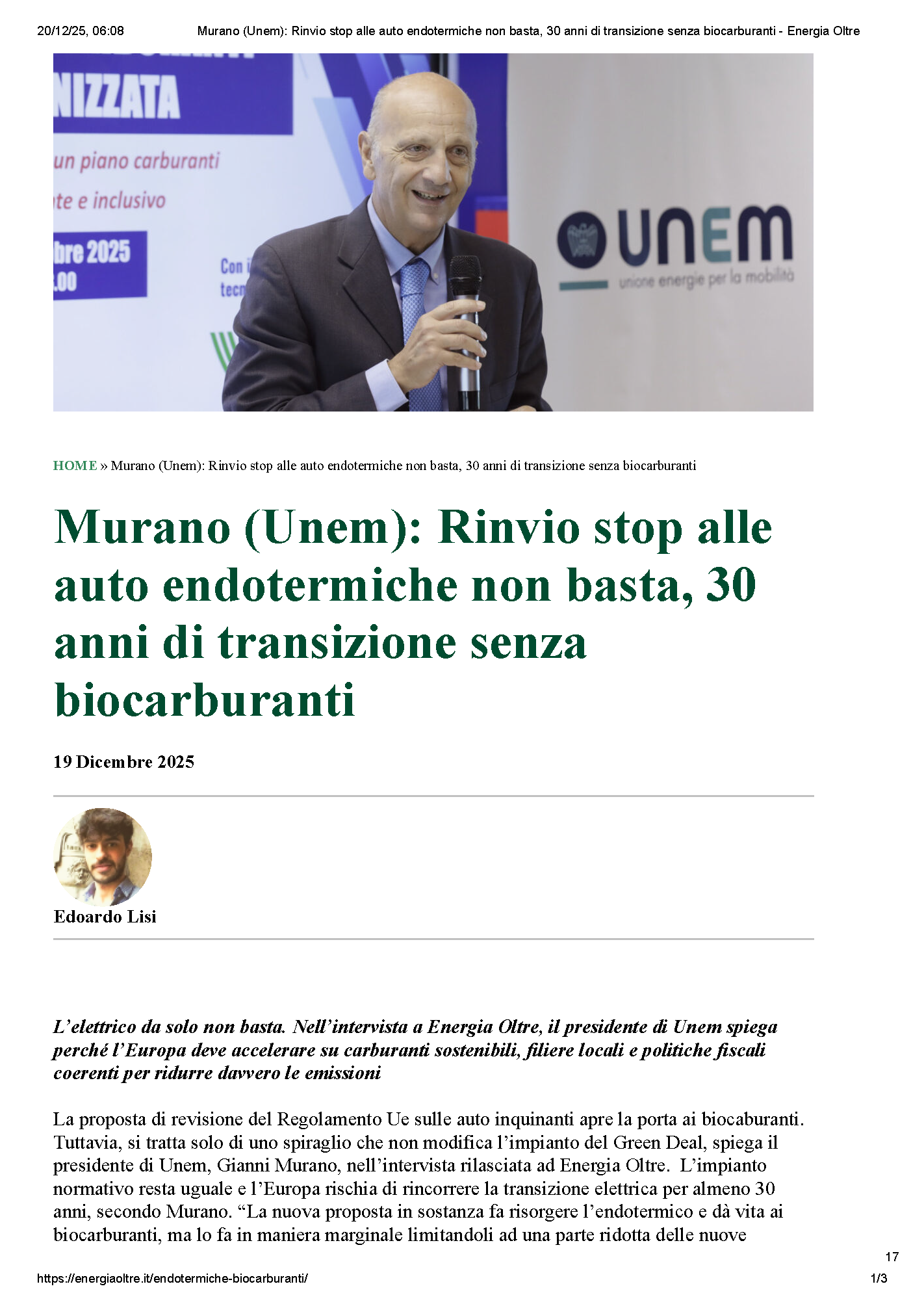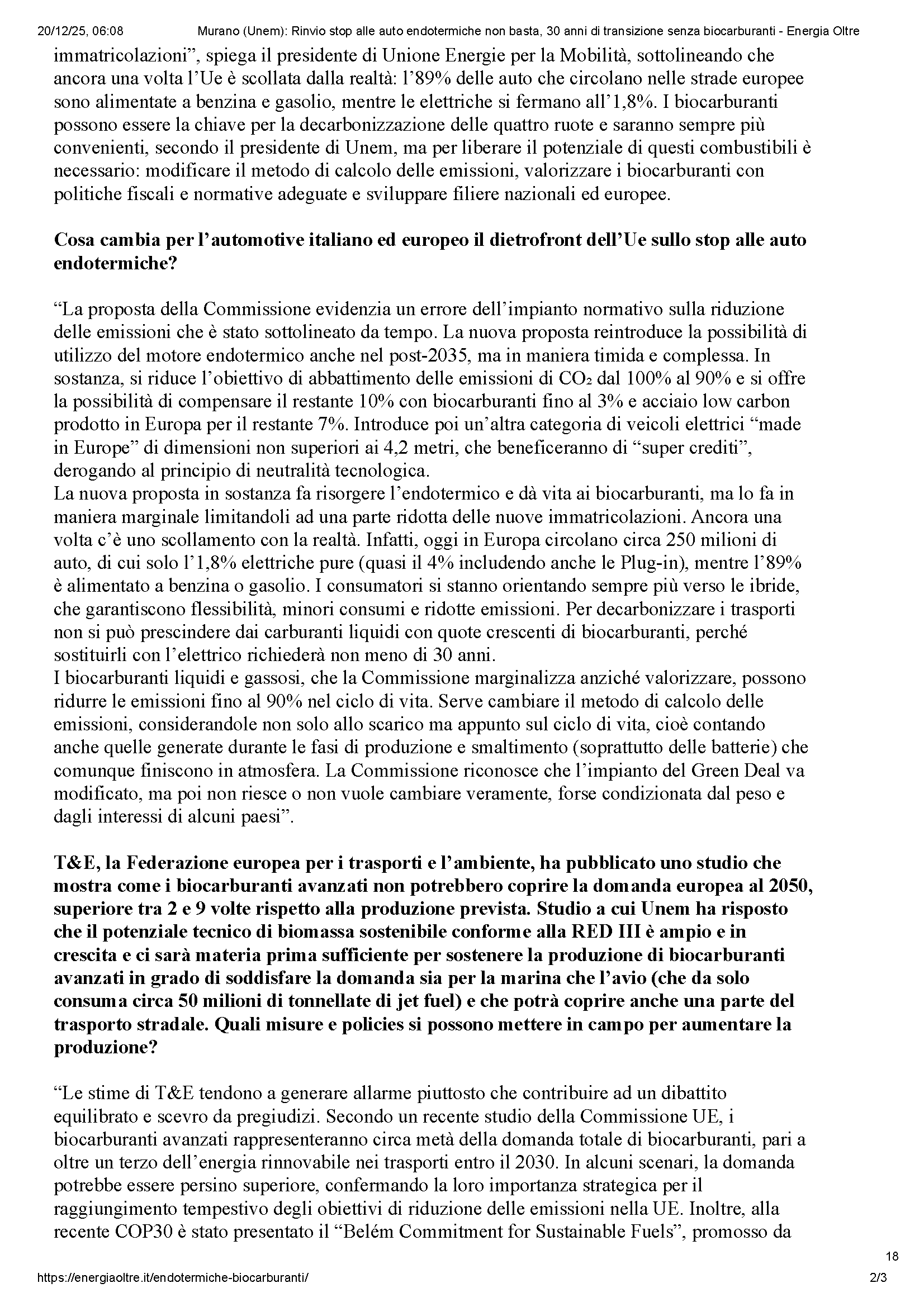 L’elettrico da solo non basta. Nell’intervista a Energia Oltre, firmata da Edoardo Lisi, il presidente Gianni Murano spiega perché l’Europa deve accelerare su carburanti sostenibili, filiere locali e politiche fiscali coerenti per ridurre davvero le emissioni.